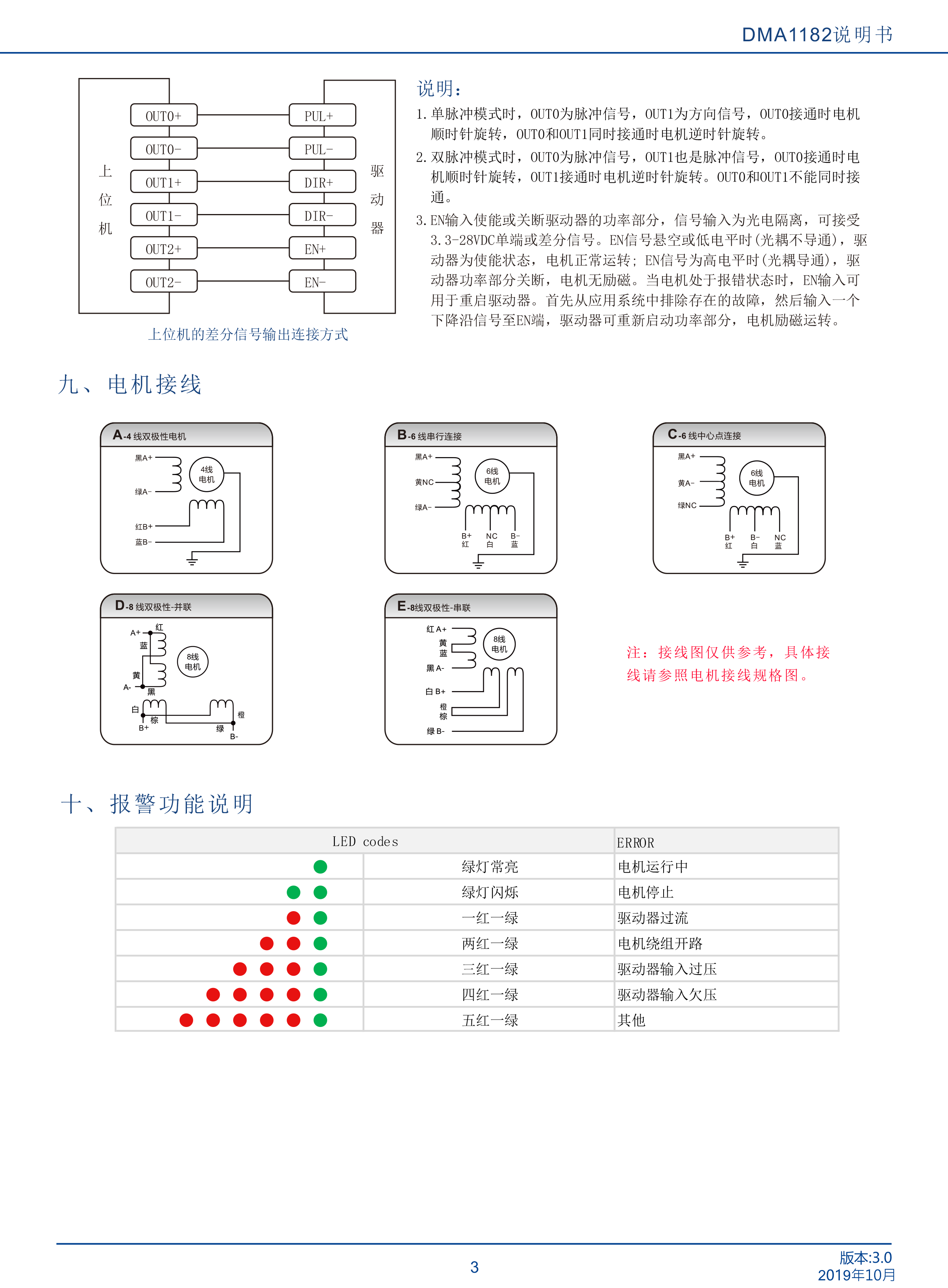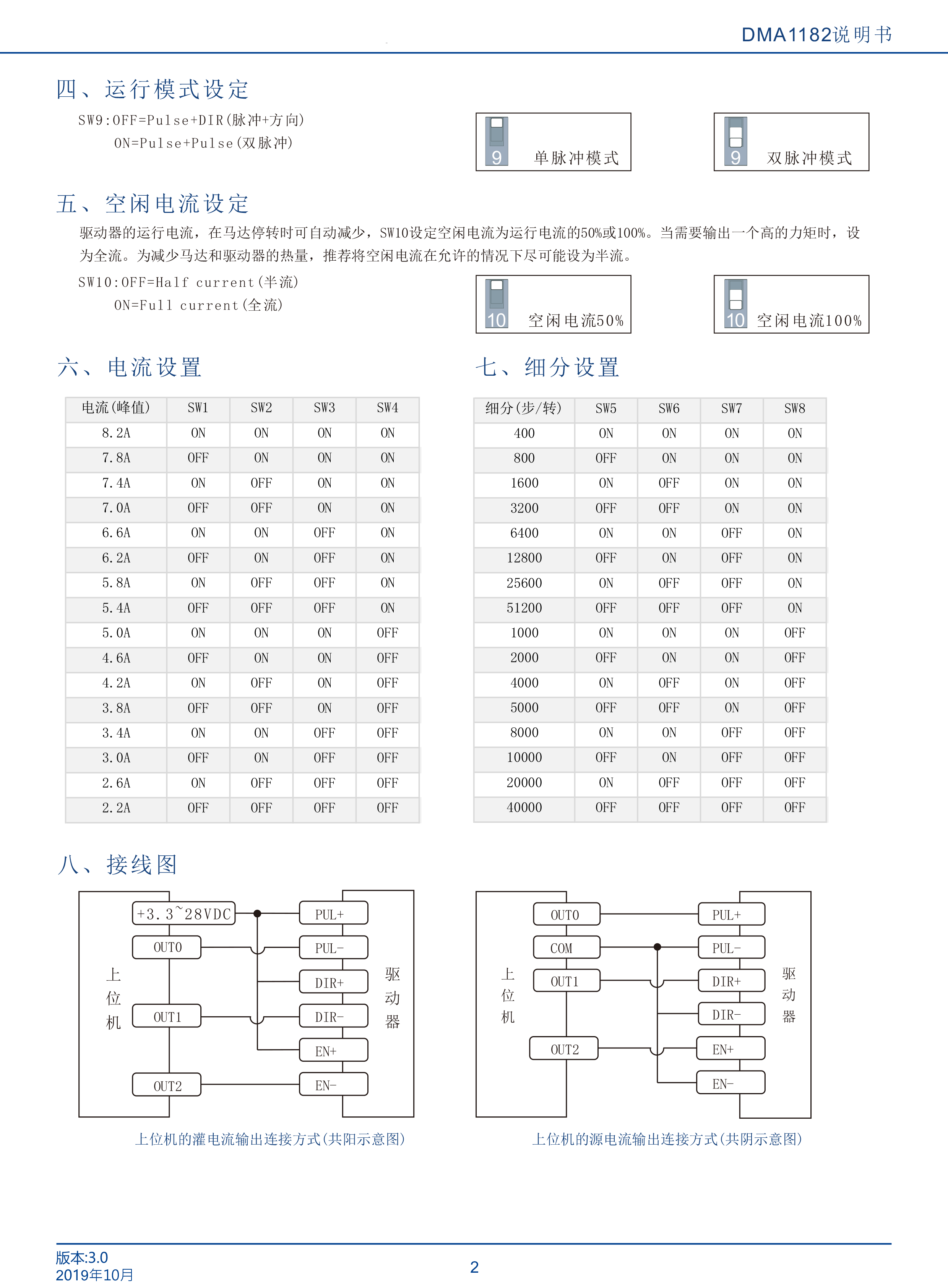 DMA1182是立成公司最新研制的基于新一代基于32位DSP技術(shù)的高性能兩相數(shù)字式步進(jìn)驅(qū)動器,驅(qū)動電壓AC18-110VAC,適配電流8.2A以下,外徑60 110mm的各種型號兩相混合式步進(jìn)電機(jī)。該驅(qū)動器采樣類似伺服的控制原理,獨(dú)特的電路設(shè)計,優(yōu)越的軟件算法處理,使電機(jī)即使在低細(xì)分下也能運(yùn)行平穩(wěn),幾乎沒有振動和噪音,平滑、精確地電流控制技術(shù)大大減少了電機(jī)發(fā)熱,外置16檔等角度恒力矩細(xì)分,最高51200細(xì)分,光耦隔離差分信號輸入,抗干擾能力強(qiáng),具有過壓、欠壓、過流保護(hù)等出錯保護(hù)功能。在點(diǎn)膠機(jī)、激光雕刻等中、低速應(yīng)用領(lǐng)域,其平穩(wěn)性、振動、噪聲性能優(yōu)勢明顯,可大大提高設(shè)備性能。