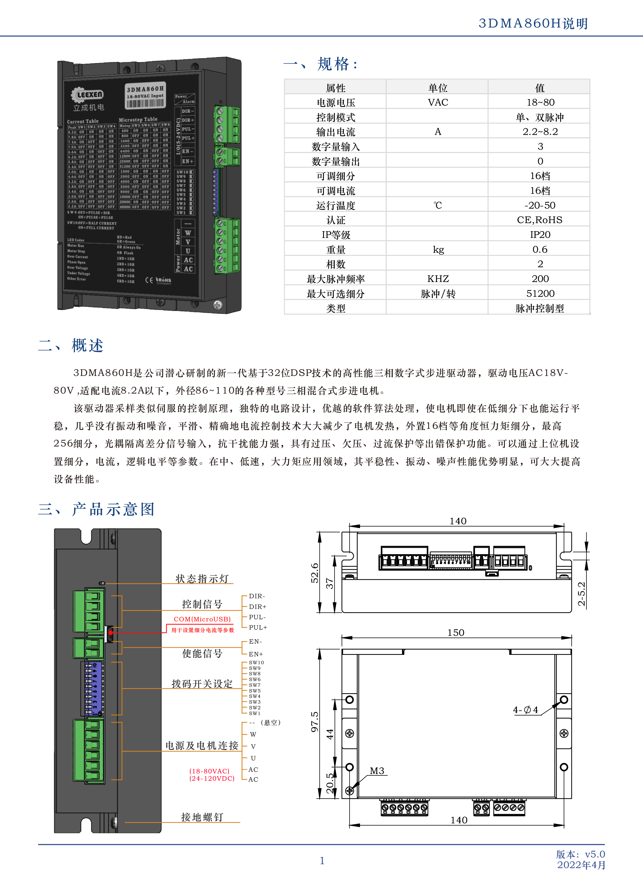 3DMA860H-1型3相開(kāi)環(huán)步進(jìn)電機(jī)驅(qū)動(dòng)器,是公司潛心研制的新一代基于32位DSP技術(shù)的高性能三相數(shù)字式步進(jìn)驅(qū)動(dòng)器,驅(qū)動(dòng)電壓AC18V80V,適配電流8.2A以下,外徑86~110的各種型號(hào)三相混合式步進(jìn)電機(jī)。