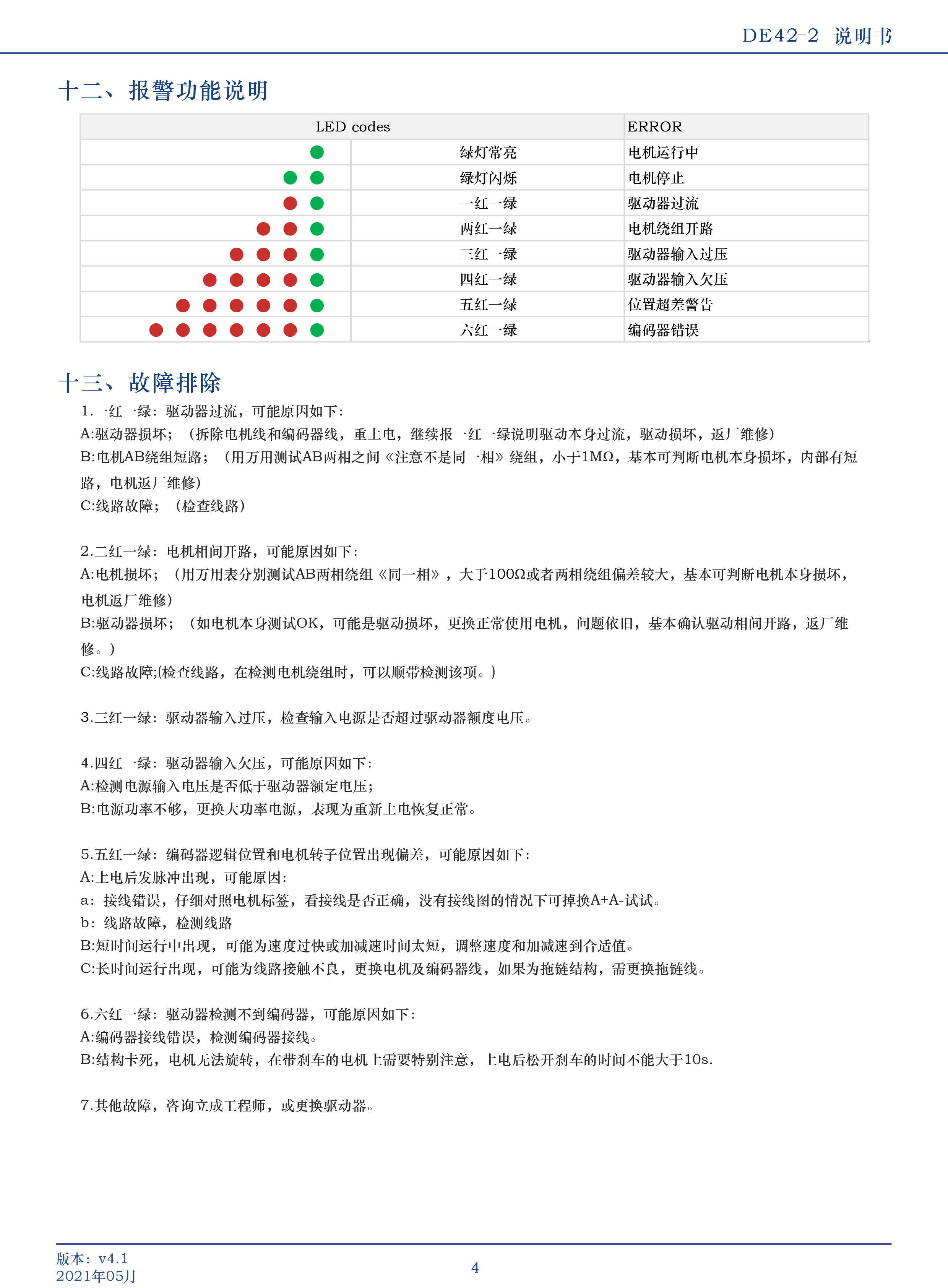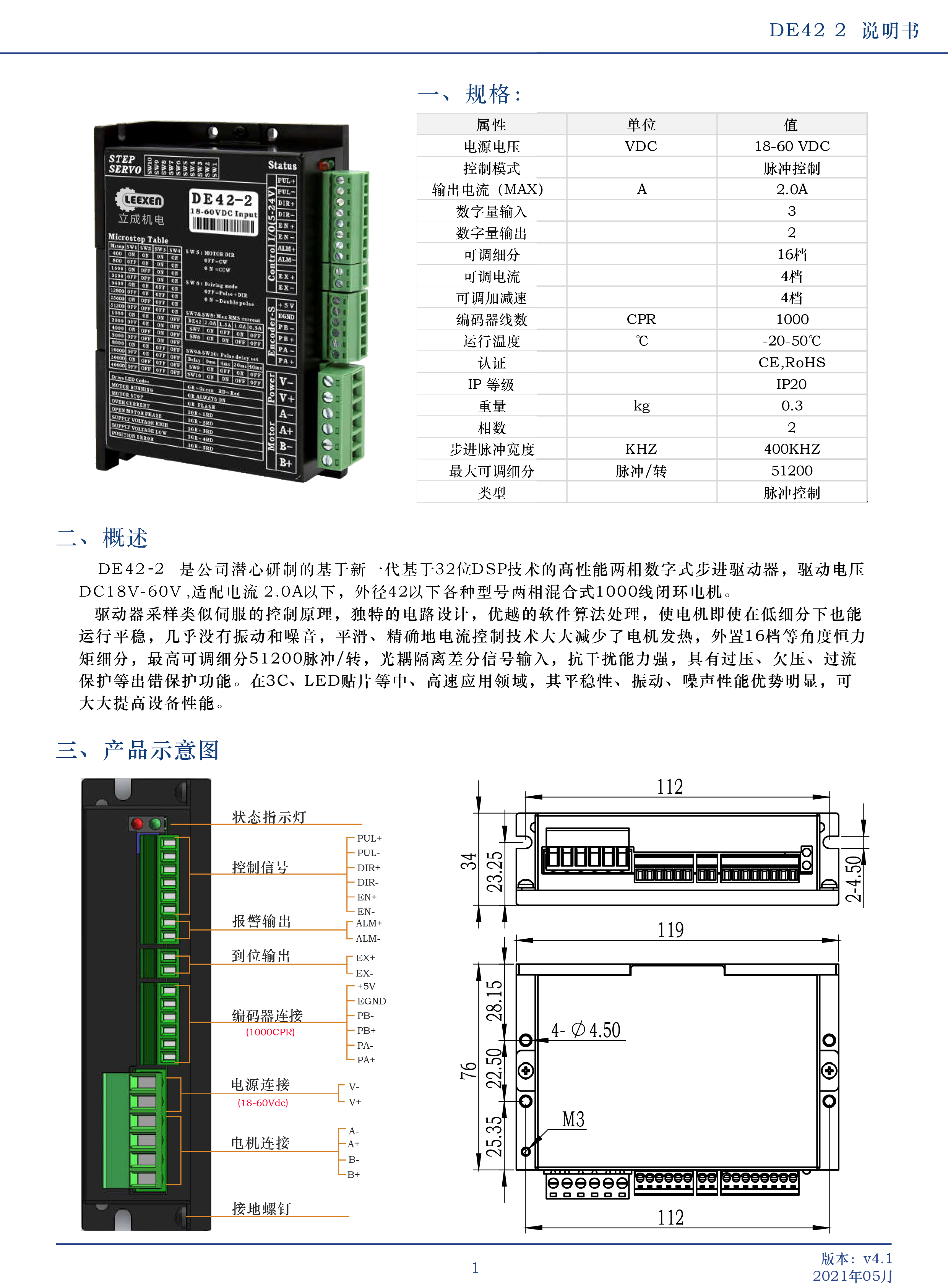 DE42-2 是公司潛心研制的基于新一代基于32位DSP技術(shù)的高性能兩相數(shù)字式步進(jìn)驅(qū)動(dòng)器,驅(qū)動(dòng)電壓DC18V-60V適配電流 2.0A以下,外徑42以下各種型號(hào)兩相混合式1000線閉環(huán)電機(jī)。驅(qū)動(dòng)器采樣類(lèi)似伺服的控制原理,獨(dú)特的電路設(shè)計(jì),優(yōu)越的軟件算法處理,使電機(jī)即使在低細(xì)分下也能運(yùn)行平穩(wěn),幾乎沒(méi)有振動(dòng)和噪音,平滑、精確地電流控制技術(shù)大大減少了電機(jī)發(fā)熱,外置16檔等角度恒力矩細(xì)分,最高可調(diào)細(xì)分51200脈沖/轉(zhuǎn),光耦隔離差分信號(hào)輸入,抗干擾能力強(qiáng),具有過(guò)壓、欠壓、過(guò)流保護(hù)等出錯(cuò)保護(hù)功能。在3C、LED貼片等中、高速應(yīng)用領(lǐng)域,其平穩(wěn)性、振動(dòng)、噪聲性能優(yōu)勢(shì)明顯,可大大提高設(shè)備性能。