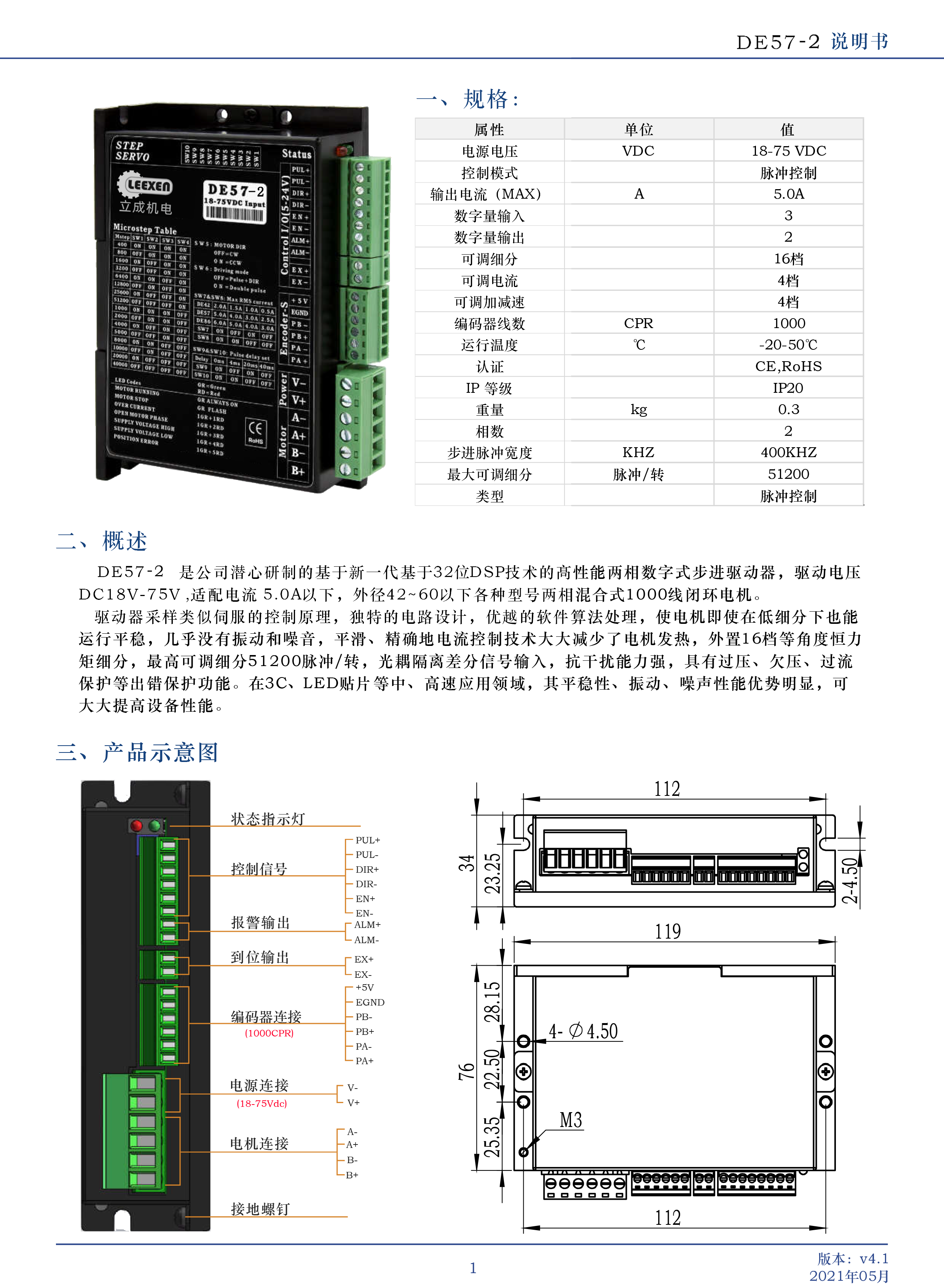 DE57-2 是公司潛心研制的基于新一代基于32位DSP技術(shù)的高性能兩相數(shù)字式步進(jìn)驅(qū)動(dòng)器,驅(qū)動(dòng)電壓DC18V-75V,適配電流 5.0A以下,外徑42~60以下各種型號(hào)兩相混合式1000線閉環(huán)電機(jī)。驅(qū)動(dòng)器采樣類似伺服的控制原理,獨(dú)特的電路設(shè)計(jì),優(yōu)越的軟件算法處理,使電機(jī)即使在低細(xì)分下也能運(yùn)行平穩(wěn),幾乎沒(méi)有振動(dòng)和噪音,平滑、精確地電流控制技術(shù)大大減少了電機(jī)發(fā)熱,外置16檔等角度恒力矩細(xì)分,最高可調(diào)細(xì)分51200脈沖/轉(zhuǎn),光耦隔離差分信號(hào)輸入,抗干擾能力強(qiáng),具有過(guò)壓、欠壓、過(guò)流保護(hù)等出錯(cuò)保護(hù)功能。在3C、LED貼片等中、高速應(yīng)用領(lǐng)域,其平穩(wěn)性、振動(dòng)、噪聲性能優(yōu)勢(shì)明顯,可大大提高設(shè)備性能。