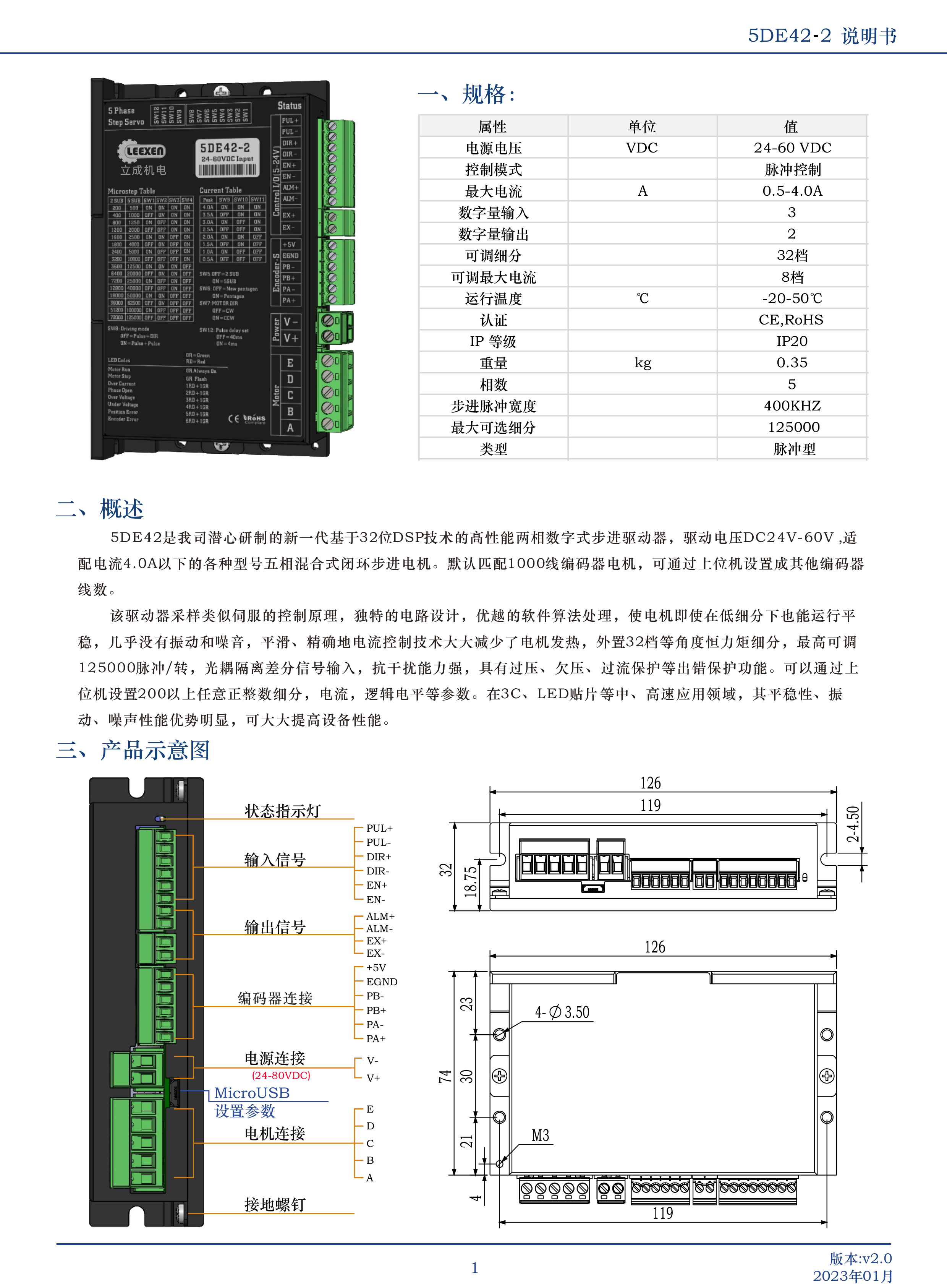 5DE42-2是我司潛心研制的新一代基于32位DSP技術(shù)的高性能兩相數(shù)字式步進驅(qū)動器,驅(qū)動電壓DC24V-60V,適配電流4.0A以下的各種型號五相混合式閉環(huán)步進電機。默認(rèn)匹配1000線編碼器電機,可通過上位機設(shè)置成其他編碼器線數(shù)。該驅(qū)動器采樣類似伺服的控制原理,獨特的電路設(shè)計,優(yōu)越的軟件算法處理,使電機即使在低細(xì)分下也能運行平穩(wěn),幾乎沒有振動和噪音,平滑、精確地電流控制技術(shù)大大減少了電機發(fā)熱,外置32檔等角度恒力矩細(xì)分,最高可調(diào)125000脈沖/轉(zhuǎn),光耦隔離差分信號輸入,抗干擾能力強,具有過壓、欠壓、過流保護等出錯保護功能。可以通過上位機設(shè)置200以上任意正整數(shù)細(xì)分,電流,邏輯電平等參數(shù)。在3C、LED貼片等中、高速應(yīng)用領(lǐng)域,其平穩(wěn)性、振動、噪聲性能優(yōu)勢明顯,可大大提高設(shè)備性能。